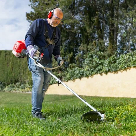 Le double guidon avec poignée ergonomique rend la débroussailleuse plus maniable sur les terrains escarpés ou lorsque des obstacles se trouvent sur le chemin, et son généreux réservoir de carburant de 1 litre permet une utilisation intensive avec une autonomie suffisante.