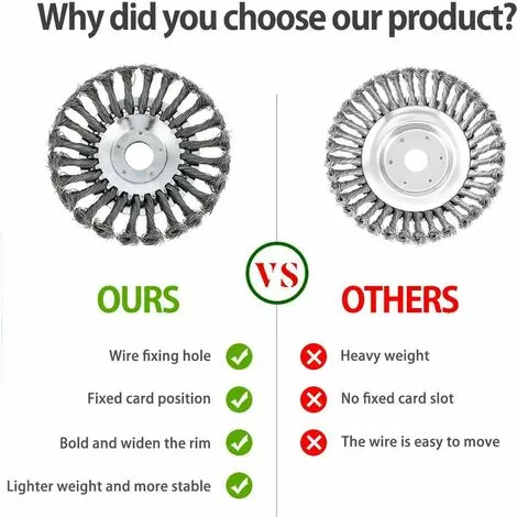 - 6. Les trous de fixation fixes et fils de la carte sont conçus pour empêcher le fil de se déplacer pendant l’utilisation et augmentent la résistance à l’usure des fils d’acier à ressorts lourds, adapté pour nettoyer les bords de la route, sur la pierre. Coudre, brique, coin et plancher, éliminer le sol, enlever la saleté tenace, etc.