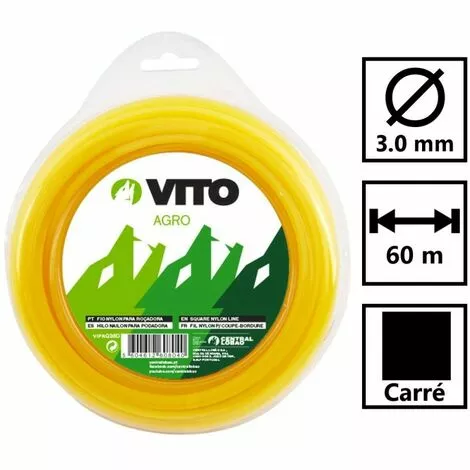 Fil nylon carré pour débroussailleuse. Le fil mesure 60m pour 3mm de diamètre. S’adapte à tous les modèles de débroussailleuse.